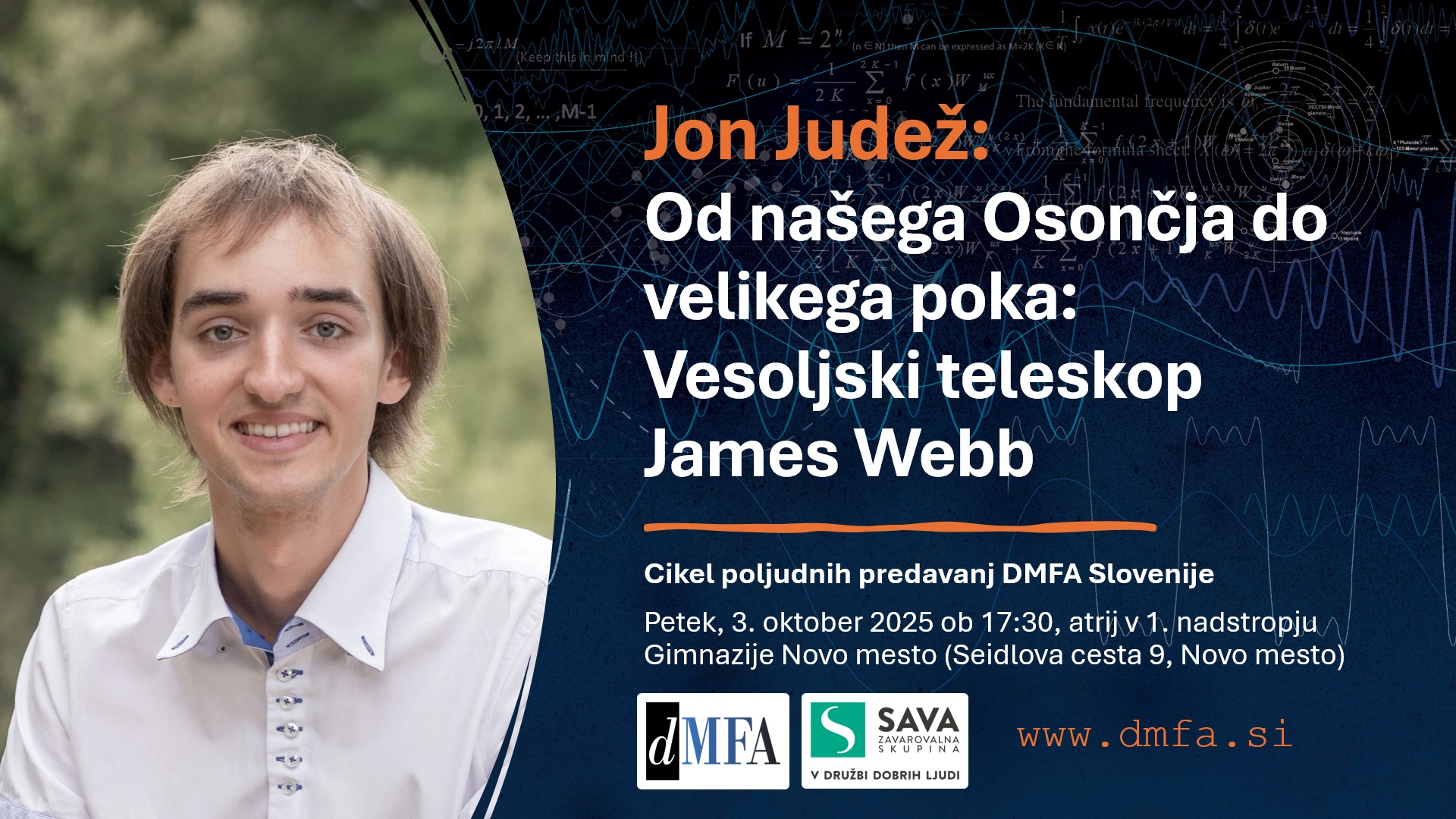 V petek, 3. oktobra 2025, ob 17:30 bo na Gimnaziji Novo mesto o zanimivi temi iz astronomije predaval Jon Judež. S tem predavanjem nadaljujemo cikel poljudnih predavanj, ki jih ob podpori diamantnega sponzorja DMFA Slovenije, Zavarovalne skupine Sava, izvajamo v različnih učnih in raziskovalnih središčih v Sloveniji. Tokratno predavanje je zanimivo tako za dijake in študente kot učitelje in visokošolske predavatelje, dostopno pa bo tudi splošni javnosti. Gimnazija Novo mesto k udeležbi lepo vabi zunanje obiskovalce. Prav vsi toplo vabljeni!