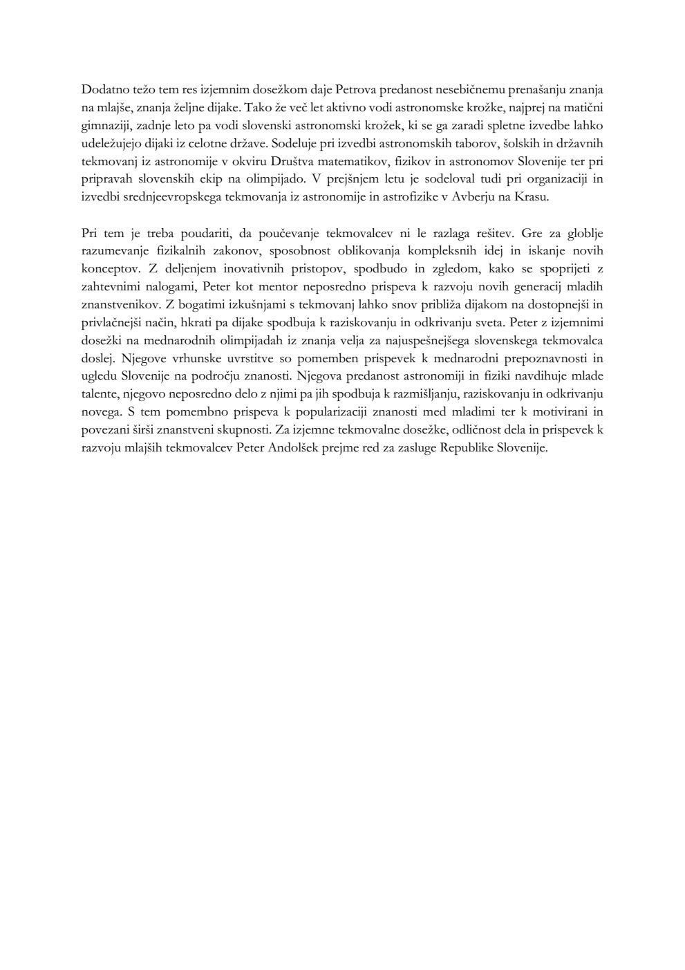 Predsednica Republike Slovenije Nataša Pirc Musar je pred Dnevom samostojnosti in enotnosti na Brdu pri Kranju podelila najvišja odlikovanja države za izjemne zasluge in dejanja posebnega pomena za blaginjo Slovenije. Prejelo jih je 25 prejemnic in prejemnikov, med njimi tudi študent fizike Peter Andolšek, ki ga je naše društvo ob podpori SAZU predlagalo na podlagi njegovih izjemnih uspehov na mednarodnih tekmovanjih, posebej na Mednarodni olimpijadi iz astronomije in astrofizike, na kateri je kar dve leti zapored osvojil absolutno prvo mesto.